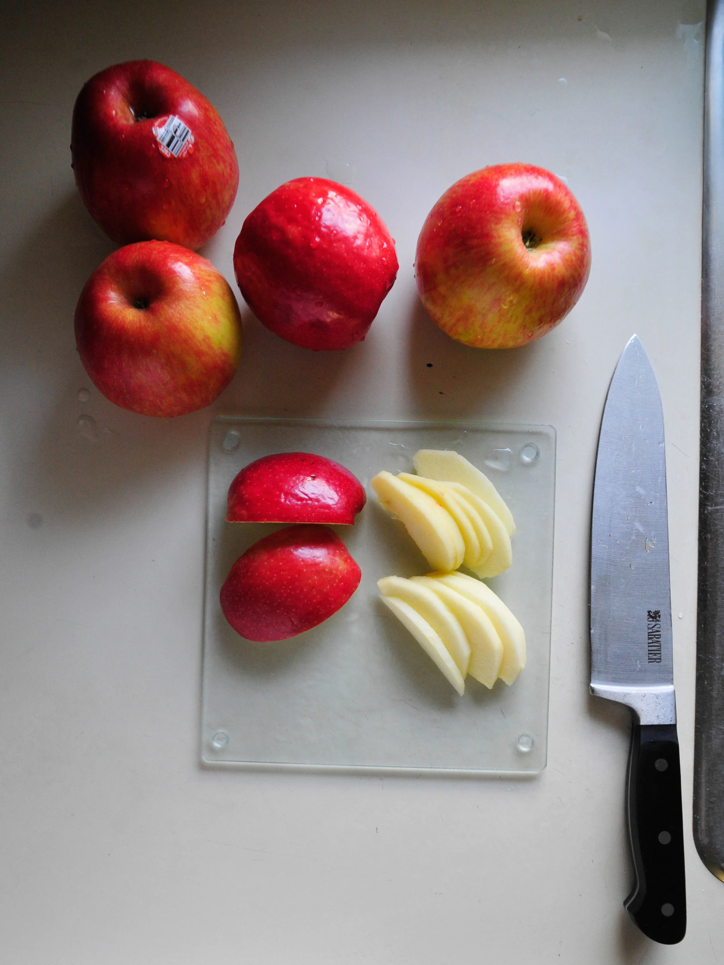 - Prep the apples by peeling them, coring them and cutting into 1/8 inch thick slices. Starting in a corner, place the apples on a diagonal, on top of the dough. Place the apple slices so they cover the top apple slices about halfway.